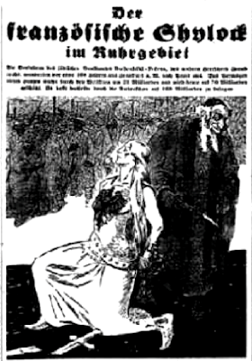 | The French Shylock in the Ruhr district. Germania is stabbed in the back by Shylock From the Völkischer Beobachter |